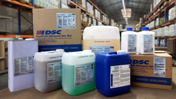 DSC and Eurochem series are manufactured using European technology and approved by major press manufacturers. Product range includes fountain solutions, blanket & roller washes, plate chemicals, and auxiliary chemicals, with FOGRA and FDA Certificates.